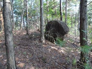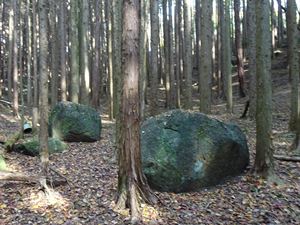 | 前方にコブが現れ点:柿野の北西のコブだと思った。コブを越えて行くと山頂部の大岩群が見えてくる。いきなりビックリの大岩が迎えてくれる。大きさ・形ではなくその位置である。如何にしたらこんな状態になるんだろう。岩の左から上がり進むと |