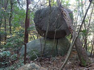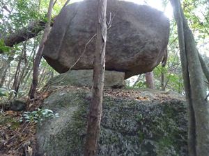 | ◆『落ちない岩』とかTVで見たことあるがまさにそのまま 神様がチョコンと持ち上げ置いたような感じ 獅子ヶ鼻にも微妙なバランスの岩があった。この辺には変った岩が多いようだ。 歩数は車着で9800歩 あの間違ったコブへ上がらなかったら7〜8000で収まっていただろう。それ程急下りもなかったので腰の方は大丈夫そうだ。 |