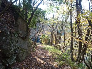 | Uターン先程のコブまで引き返す。東へ少し入った所にチョッとした展望地 見えたのは三国山だったかもしれない。ヤブを抜け歩き易くなり下ると鞍部の様子 右手を確認するも木々の茂りで見えず 目前の10m程のコブかなー?と上がるも今日一番のヤブに出くわした。ピークを越え下るも先に高い所はなかった。先程の鞍部へ戻るのもひと苦労だった。戻ってウロウロ 薄い踏み跡を見つけホッとする。このすぐ先に右手へ下る明瞭な道があった。(帰宅後気付いたが 地形図の分岐Bへ繋がる道かもしれない) |